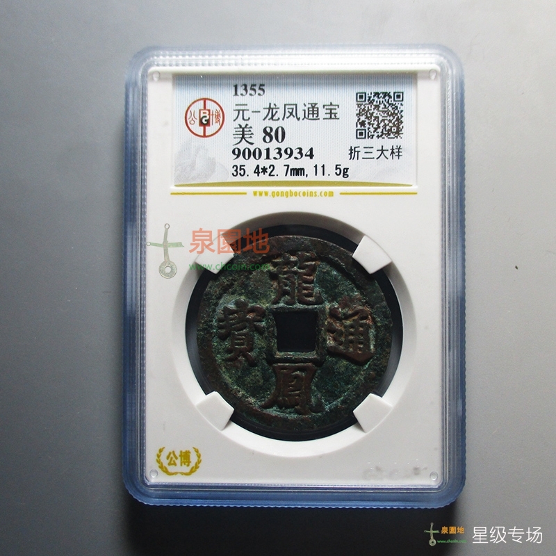 龙凤通宝折三大样评级币,直径尺寸:35.4*2.7MM,重量:11.50g。图中龙凤通宝折三大样评级币价格为: 36000.00元,藏品版别和品相不同,价格亦有所差异。